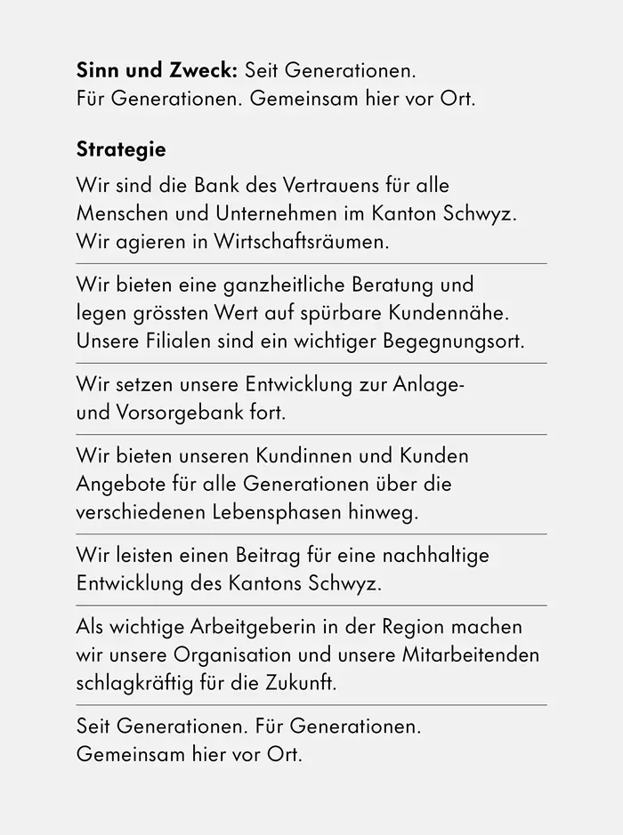 Zur Umsetzung der Strategie wurden 14 strategische Initiativen abgeleitet, mit dem Ziel, nachhaltigen Mehrwert für Kundinnen und Kunden sowie den Kanton Schwyz zu schaffen und die Zukunftsfähigkeit der Bank sicherzustellen.